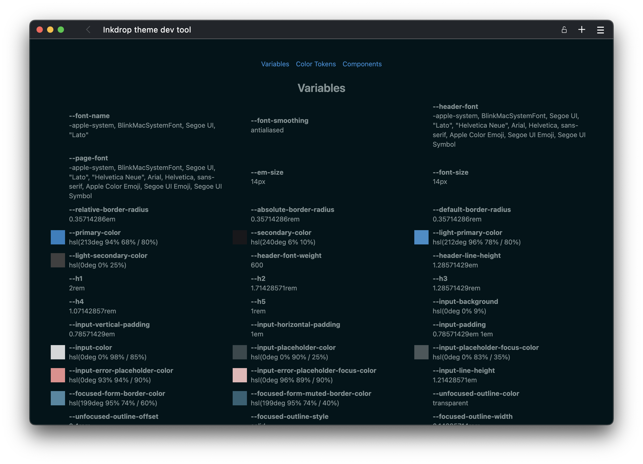 - Variables: Lists all the CSS variables used in the app. As you can see, it includes not only colors but also border radii, sizes, font weights, and more. However, you don’t need to change every variable for your theme