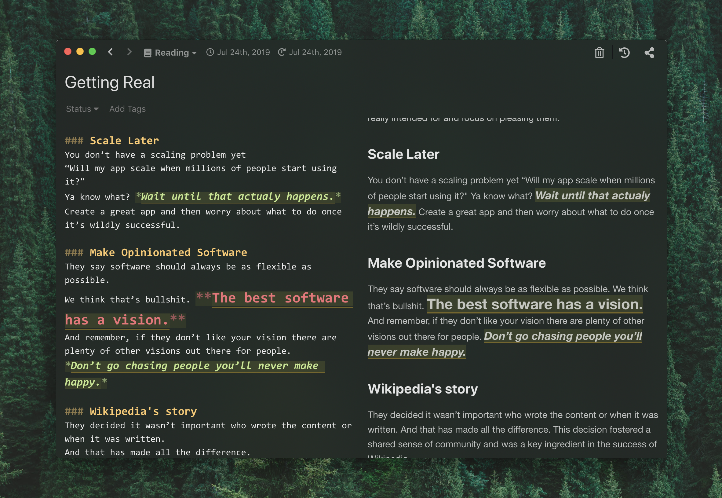 In Inkdrop, you make notebooks for each purpose. Inkdrop lets you change styles of those emphasises that only apply to a particular notebook so you can keep your notes fully compatible with GFM. For example, if you want to quote and highlight texts from books you read, you make a notebook named something like "Reading". And you can define stylesheets only applied to notes in this notebook.